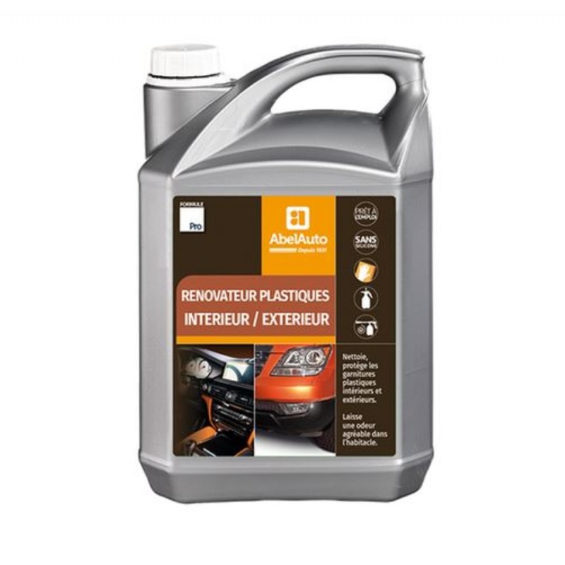 Nettoie, protège et redonne leur aspect d’origine aux revêtements et garnitures plastiques intérieures et extérieures. Redonne l’aspect du neuf aux durits et cache de protection des moteurs. Sans silicone. Parfume agréablement l’habitacle. Bidon de 5 litres. Au chiffon : Imbiber un chiffon microfibre, enduire uniformément de produit les garnitures plastiques ou caoutchouc et essuyer. Pulvérisateur à main : Pulvériser sur les parties plastiques en évitant soigneusement les tissus et les vitres. Essuyer sans appuyer avec un chiffon microfibre.Conseils AbelAuto : Ne pas appliquer sur les caoutchoucs des pédales, le cercle du volant et les vitres.